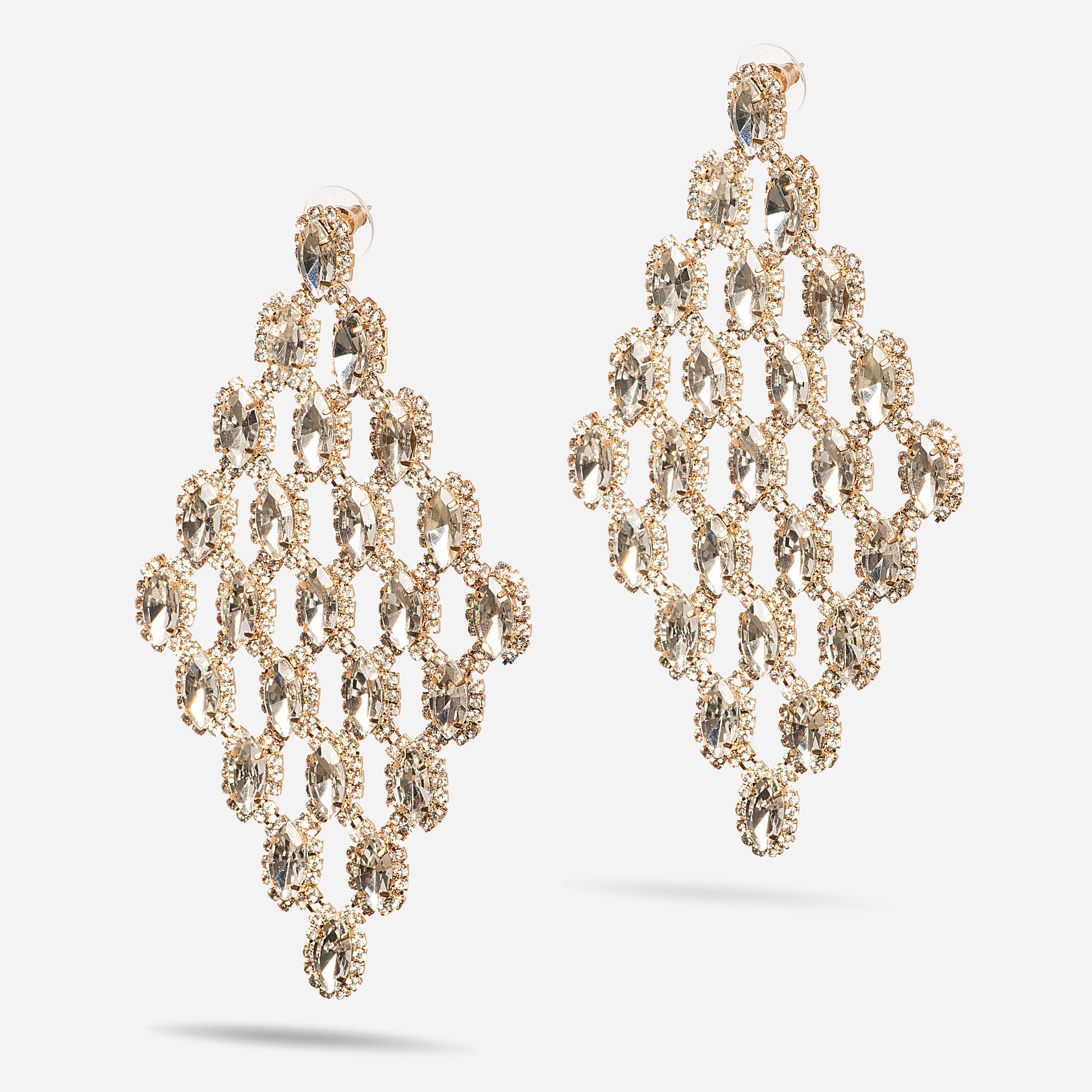 Elegante, diamantförmige Statement-Ohrringe aus goldschimmernden, filigran miteinander verbundenen Elementen. Die leichte, bewegliche Struktur sorgt für einen funkelnden Effekt bei jeder Bewegung – perfekt für besondere Anlässe und glamouröse Auftritte.