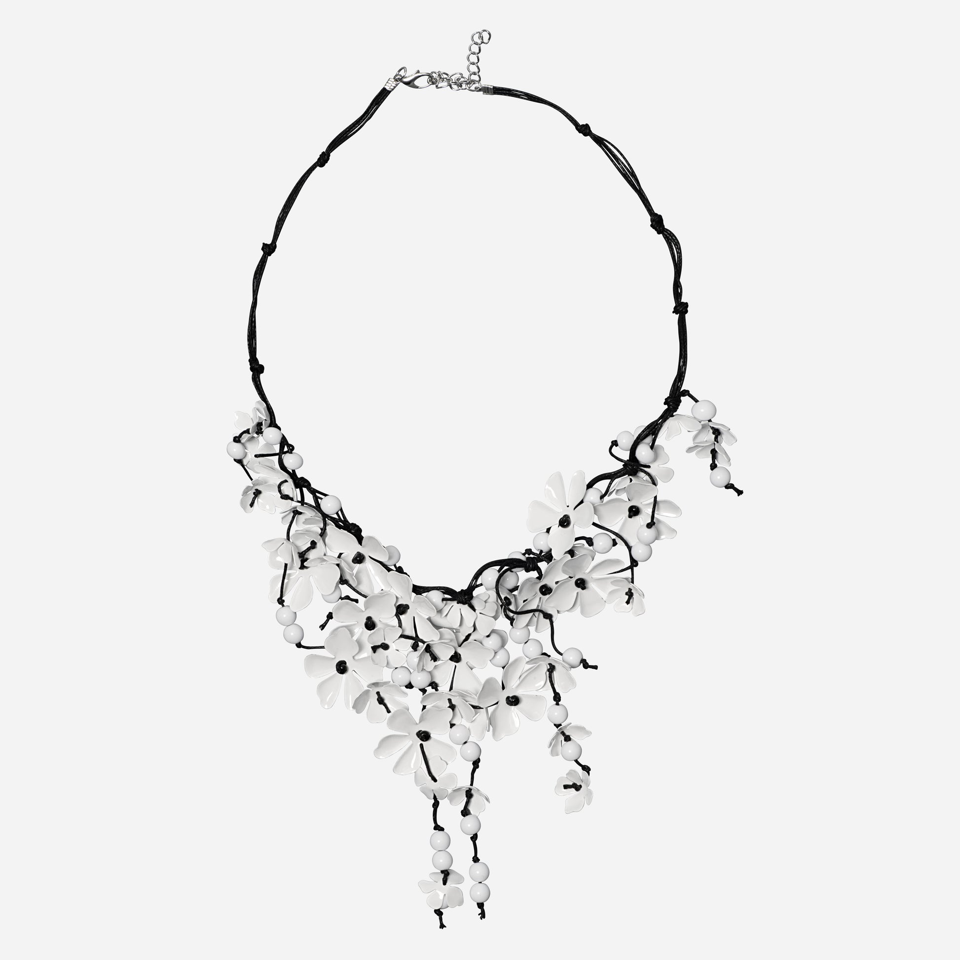 Eine kunstvolle Statement-Kette in reinem Weiß, komplett in Handarbeit gefertigt. Filigrane Blüten und Perlen sind harmonisch auf schwarzen Fäden arrangiert und bilden einen eleganten, fließenden Verlauf. Dieses besondere Schmuckstück passt perfekt zu tiefen Ausschnitten, Abendkleidern oder besonderen Anlässen – lässt sich aber auch wunderbar im Alltag als stilvoller Akzent tragen. Ein einzigartiges, leichtes und zugleich ausdrucksstarkes Design.