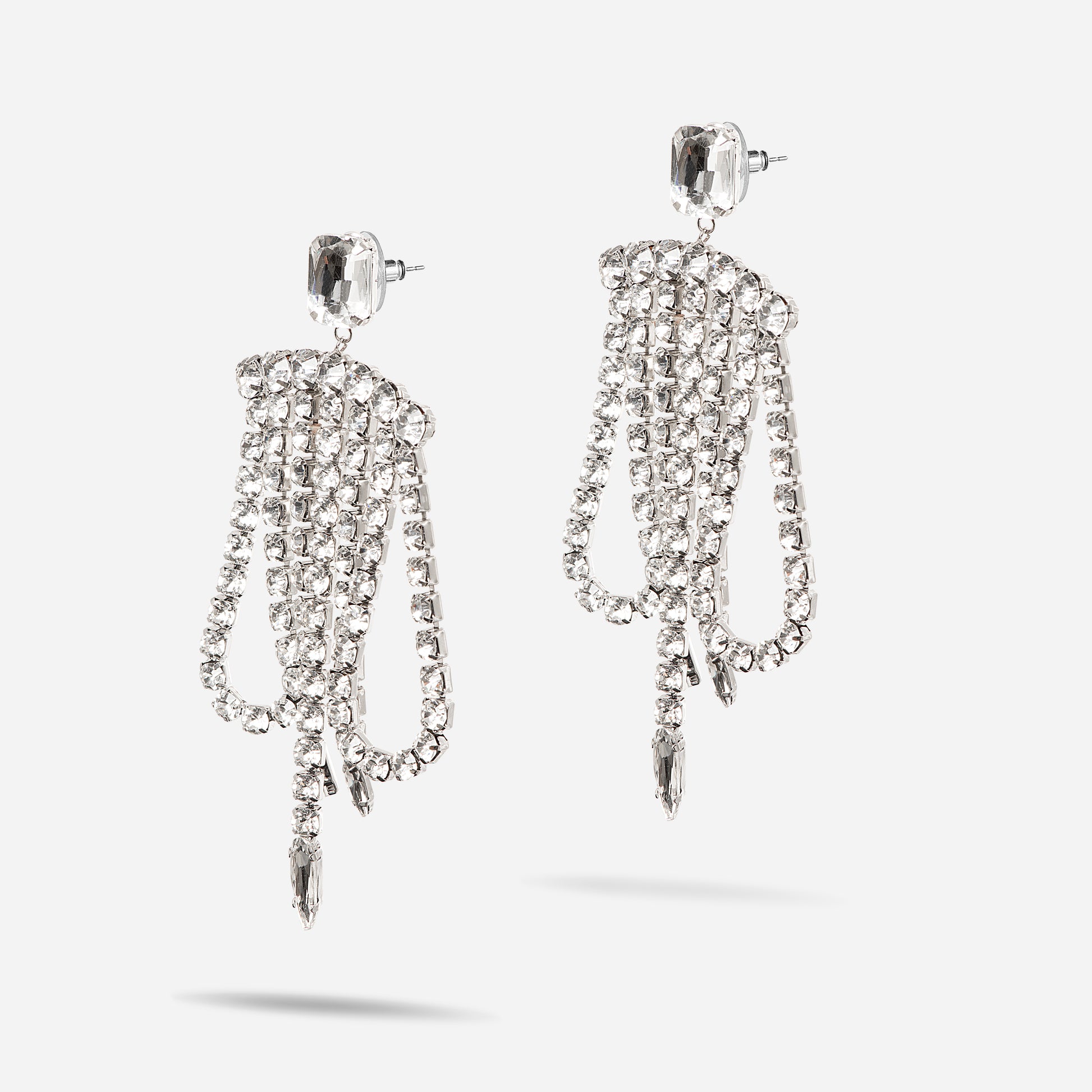 Glamouröse Statement-Ohrringe mit mehreren Reihen funkelnder Steine, die in eleganten, fließenden Linien fallen. Durch ihr intensives Strahlen sind sie die perfekte Wahl für besondere Abende – ob Silvester, Weihnachten oder ein exklusives Event. Diese Ohrringe ziehen garantiert alle Blicke auf sich und verleihen jedem Look eine luxuriöse, extravagante Note.