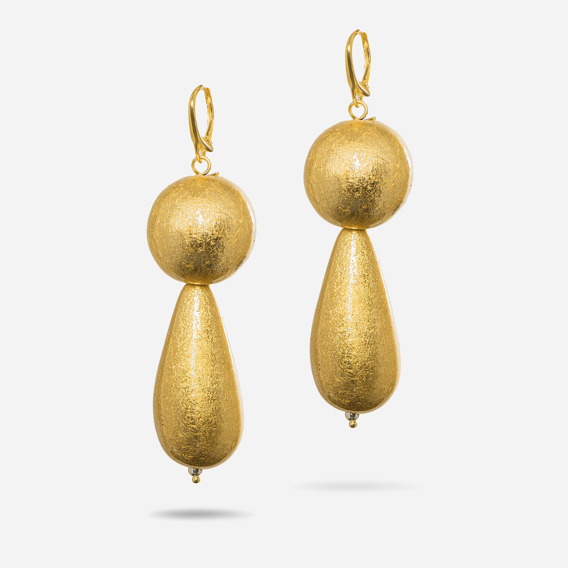 Diese leichten Statement-Ohrringe bestehen aus fein gearbeitetem Holz, das kunstvoll mit Goldblatt veredelt wurde. Das elegante Tropfen-Design wirkt modern, edel und außergewöhnlich leicht am Ohr. Aurora – schick, zeitlos und ideal für besondere Auftritte.