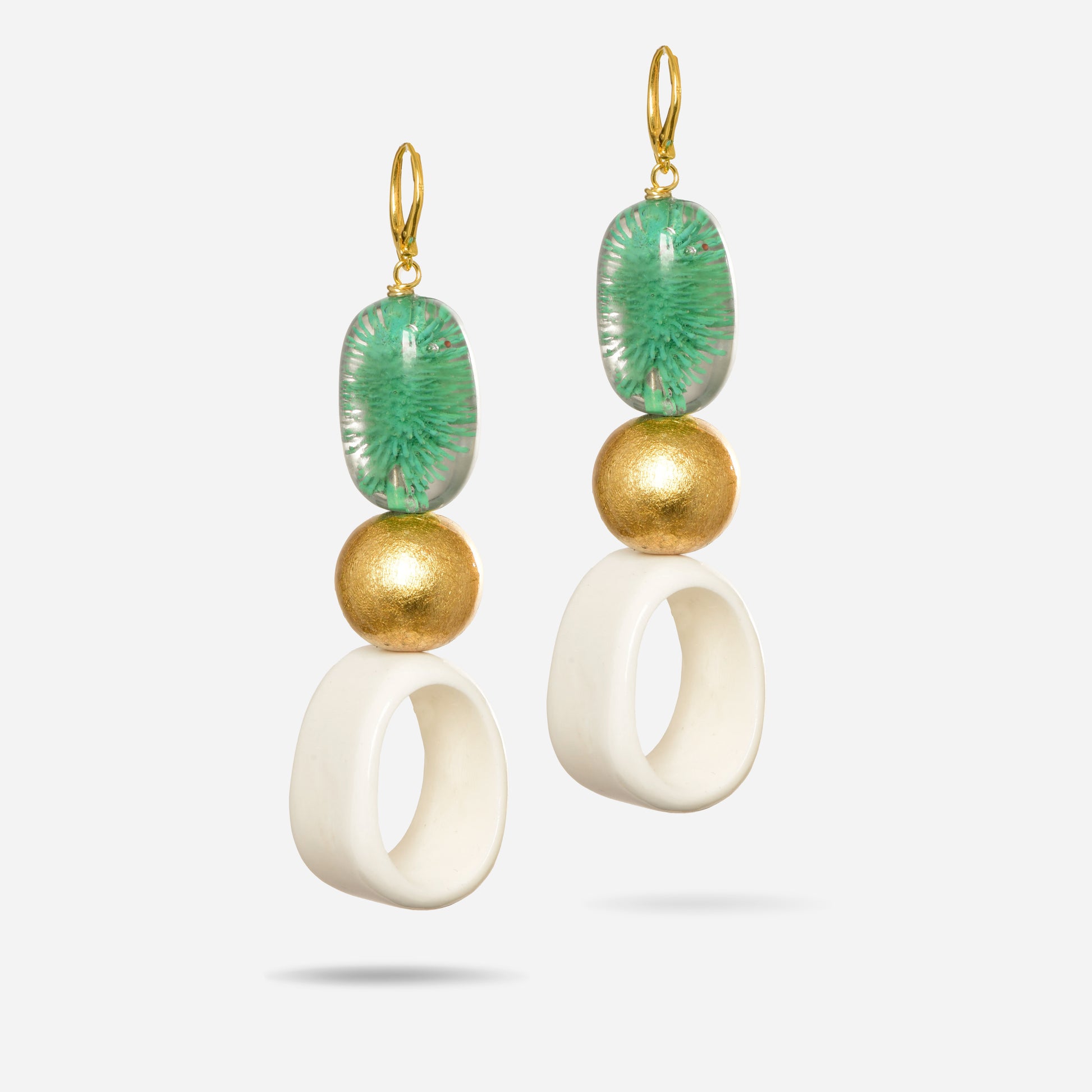 Verdea vereint natürliches Horn, warmes Holz und einen zarten Hauch von Grün zu einem modernen, kunstvollen Design. Die goldvergoldeten Ohrhaken setzen einen luxuriösen Akzent, während die Materialien leicht und organisch wirken. Ein stilvolles Statement für Frauen, die Eleganz mit Natürlichkeit verbinden möchten.